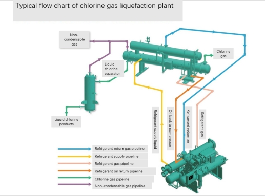 1.1 Energy Consumption Reduction Due to Advanced Technology: Traditional liquid chlorine production mainly involves low-pressure, medium-pressure, and high-pressure methods. Among them, the high-temperature, high-pressure method is considered a more energy-efficient and environmentally friendly clean production process. Compared to the low-pressure method, which requires deep freezing, the high-pressure method utilizes increased pressure (1.4~1.6MPa) to liquefy chlorine gas at ambient temperatures of 30~50℃, eliminating the need for a large refrigeration system. Therefore, it has the shortest process, simplest operation, and lowest overall energy consumption. Studies have shown that its comprehensive economic and environmental benefits are significant, making it an ideal choice for enterprises producing liquid chlorine products. 1.2 High Performance of Core Equipment: The core of a liquid chlorine production line is the chlorine liquefaction unit. Taking the economizer screw-type chlorine liquefaction unit as an example, its advantages are very prominent: l High Efficiency and Energy Saving: Compared to the old-fashioned reciprocating compressor, this unit has higher refrigeration efficiency and significant energy-saving effects. Data shows that using a screw-type unit compared to a reciprocating unit can save approximately 290,000 yuan in electricity costs annually (based on historical data). l Stable and Reliable: The unit operates smoothly, occupies a small area, and is easy to maintain. l Precise control and automation: Advanced units such as the YCL chlorine liquefaction unit are equipped with adjustable expansion valves and automatic liquid level control systems, which can automatically adjust according to production load to achieve fully automatic unattended operation. This not only makes operation convenient but also ensures continuous and stable performance. |